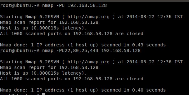 You can also specify the port number for scanning, like –PU 22, 80, 25, etc. In the above picture, the target is my LAN's IP, which doesn't have any UDP services.