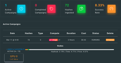 I also saw the active campaigns, completed campaigns, ingested hashes, and success rate. The history of all campaigns is also provided, and as is shown below, I had a running campaign.