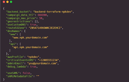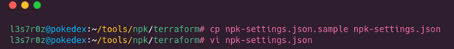 It was now time to configure the local NPK settings on my machine. I copied the sample npk-settings.json.sample file to a working npk-settings.json file, then edited my AWS credentials into it. You can access and verify these as shown in the screenshot below: also, note that the named credential profile that AWS CLI and Terraform use while deploying NPK must be the same.