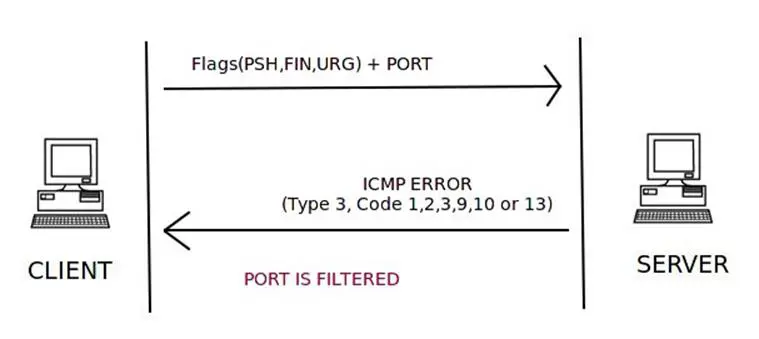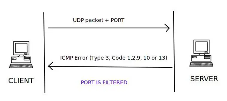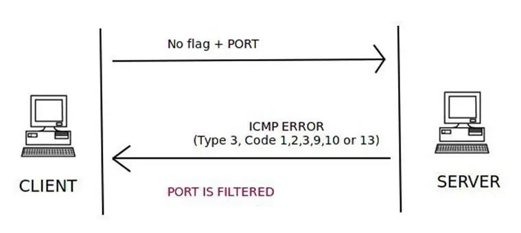 If the server responds to the client with an ICMP error type 3 and code 1, 2, 9, 10, or 13, then that port on the server is filtered.