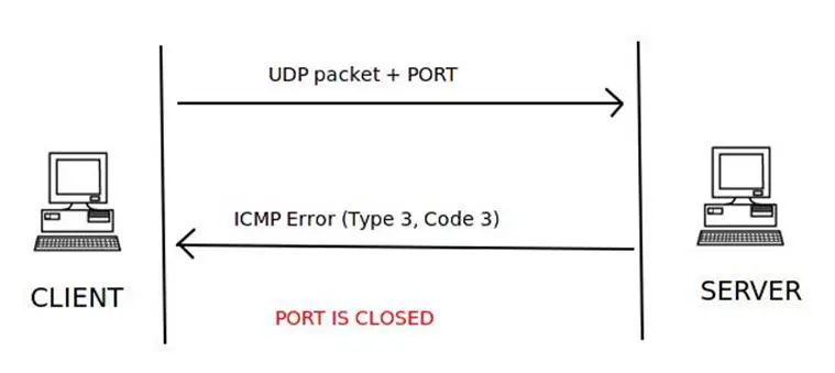 The client sends a UDP packet and the port number it wants to connect to, but the server responds with an ICMP port unreachable error type 3 and code 3, meaning that the port is closed on the server.