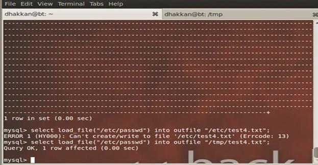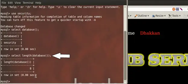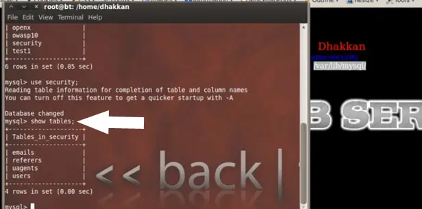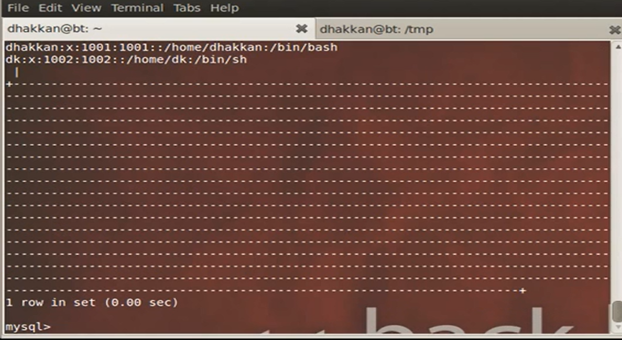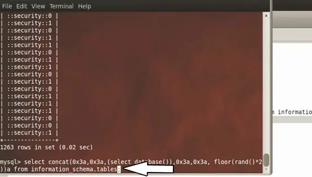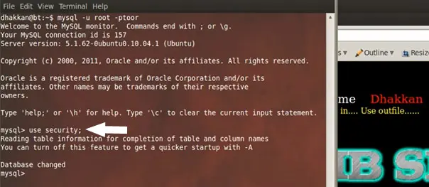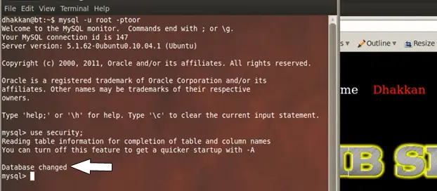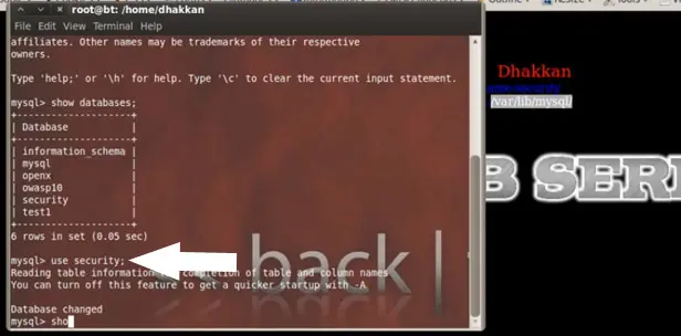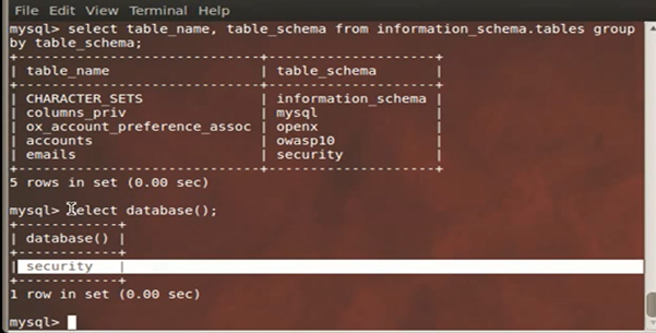 For the purpose of this lab the database name is security so we select security through the command.