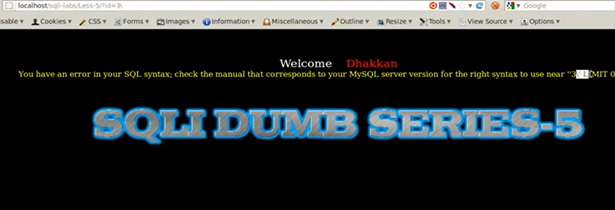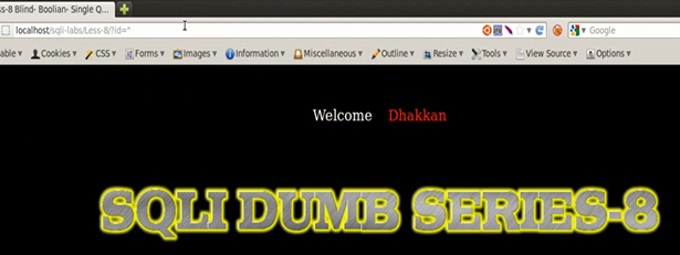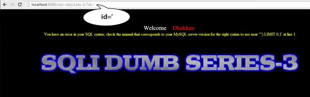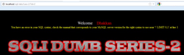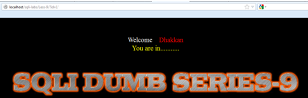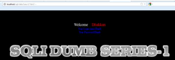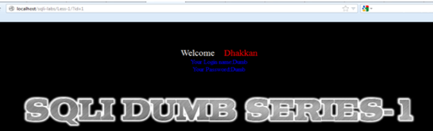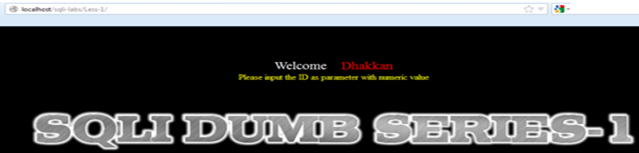 You get a "Welcome Dhakkan" (a Hindi slang word that usually refers to a stupid person). The programmer for SQLI Labs definitely has a good sense of humor. Now we get a parameter "id" with numeric value injection.