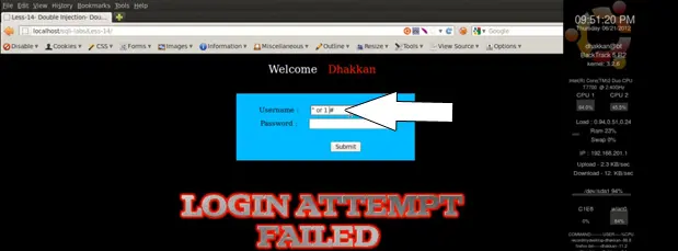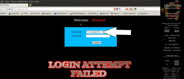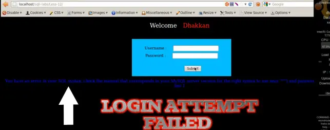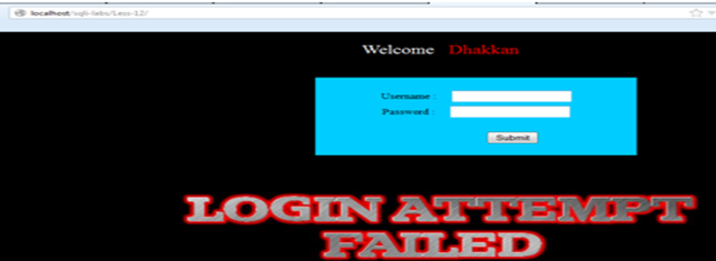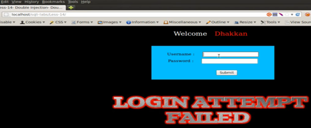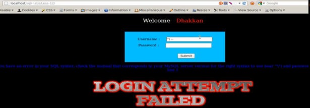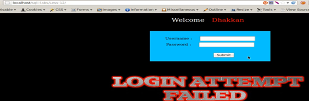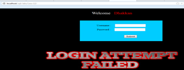 Now we try the query again, using username=" ' " and password= " ' " (single quotes). We get a login failed attempt again.