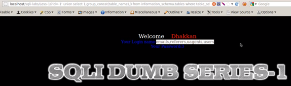 ?id=1”) union select 1,group_concat(table_name)3 from information_schema.tables where table_schema=’security’ - -+
