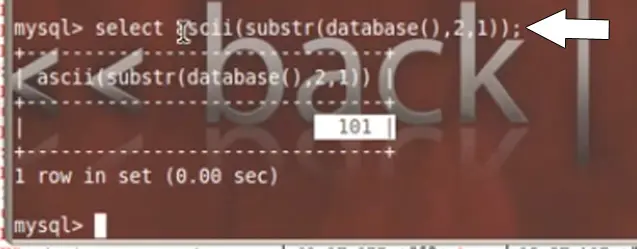 Select ascii(substr(database(),2,1)) = 101;