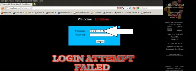 In this lesson we will learn to perform an error-based double quotes injection attack as shown below.