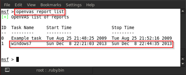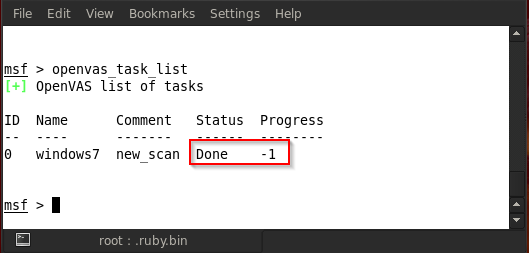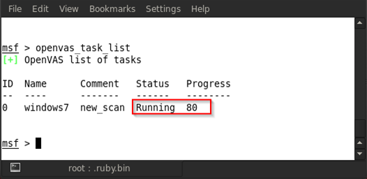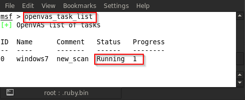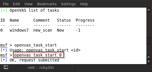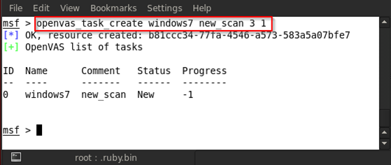For example, in the above figure, we type in openvas_task_create windows7 new_scan 3 1
