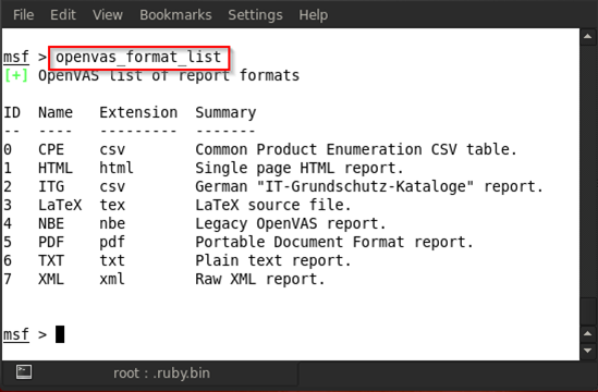 There are several formats for downloading the report. Type in openvas_format_list and it will list all available formats.