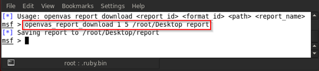 After choosing the format, we can download the report by using this command: openvas_report_download <report id> <format id> <path for saving report> <report name>. Here we are using openvas_report_download 1 5 /root/Desktop report