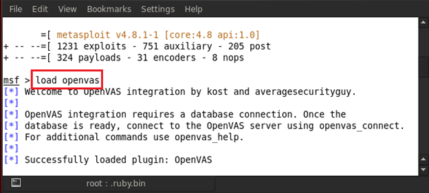 To run OpenVAS, type in load openvas in msfconsole and it will load and open the VAS plug-in from its database.