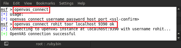 We have to connect our OpenVAS to its server by giving the command openvas_connect and it will show the full usage command, which is openvas_connect username password host port <ssl-confirm> for connecting to the server. In my case, the command is openvas_connect rohit toor localhost 9390 ok