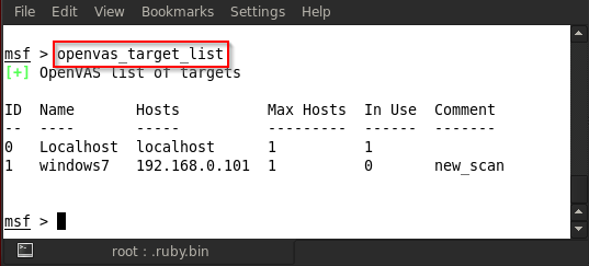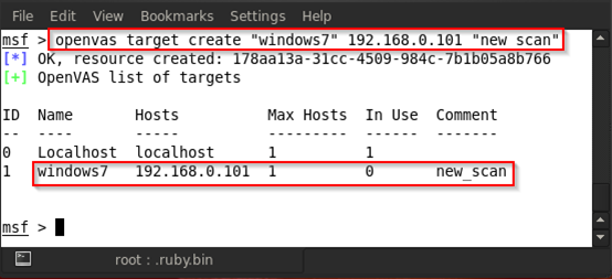 As can we can see in the above figure, our OpenVAS connection is successful. Now we will create a target for scanning. The command for creating a target is openvas_target_create <scan name> <target IP> <any comments> . In the below figure, we can see my scan name is windows7 , the target is 192.168.0.101 and the comment is new_scan , so the command is openvas_target_create "windows7" 192.168.0.101 "new_scan"