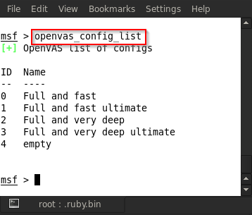 After creating the target, we want to see the OpenVAS's scan configuration list, so type in openvas_config_list.