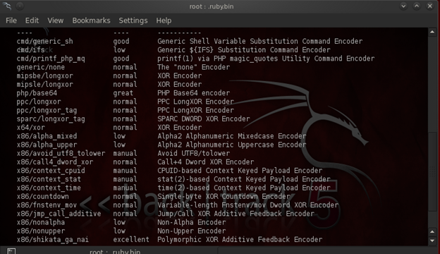 -e can be used to specify the type of encoding needed. Here I am using shikata_ga_nai encoding and –t for the type of file extension. Here it's an exe file. Below is the image of the list of encoders available in MSF.