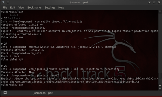 The joomscan scans all the plug-ins installed and gives details about the vulnerabilities. We can use this information for further attacks.