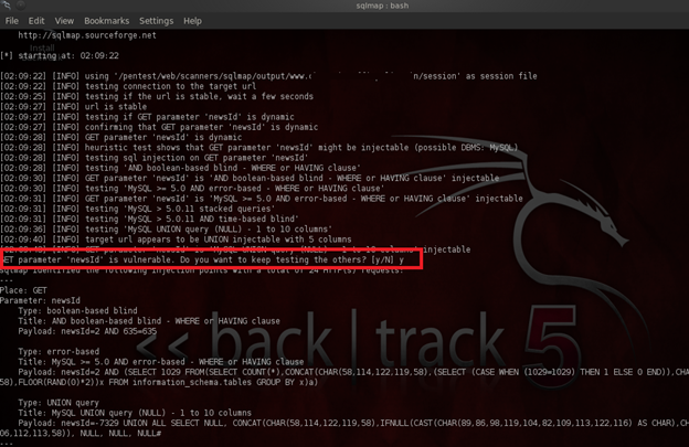 SqlMap is another good tool in the vulnerability assessment category. This tool can test whether the target url is vulnerable or not. Below is the example, where the highlighted text tells us that the parameter "newId" is vulnerable. The usage is as follows: