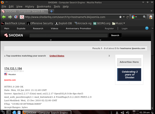 This is, again, another web-based assessment tool of particular usefulness for pentesters. It can be used to gather a range of intelligence about the target devices which are connected to the internet. We can, for example, search to see if any network devices like routers, Voip, Printers, cams etc. are in place. To search if any service is running in the domain, the syntax would be: