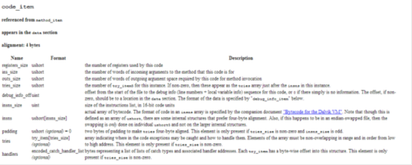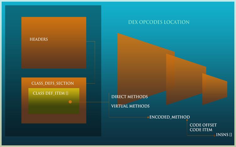 Next we try to locate where the executive opcodes are. You will find that they are in the code_item structure that is referenced from the method_item type. The insns field within the code_item structure contains an array of 2-byte sized elements (4-byte alignment is also done with larger opcodes, thus overriding the default spec) of rank specified in the preceding field, "insns_size." Each method can be either virtual or direct, as the dex file is itself converted from the .class files of a java application. The class_data_item structure references these method lists. The class_data_item is referenced from the class_def_item structure in the class_defs section.