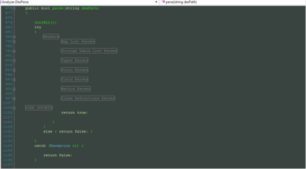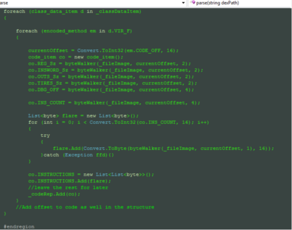 - Finally, the actual parsing begins from the in-memory byte array and the class members for the dex file structures are filled in by traversing the byte array. Once it is filled in, we dig into the instruction array and store the opcodes for retrieval for the disassembler class. After this we are done!