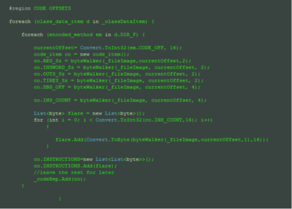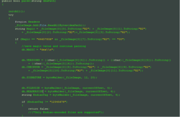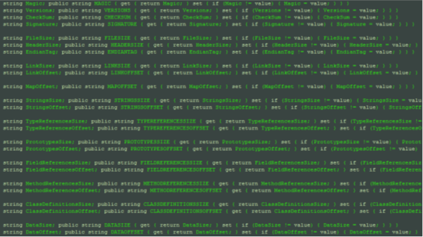 We have taken a look at the process of coding a parser for the binary format—DEX in C# (OOP). If you find any other binary format you wish to parse like PE format, you know how you might approach it. For those of us looking for a bit of challenge try doing the same in a functional programming language like Haskell. The process can be interesting and the approach is quite different from OOP.