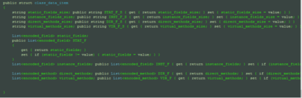 To give an idea of the struct members that constitute the dex data structures, let us take a look at three of the structures coded.