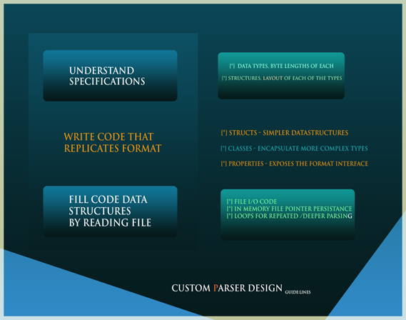 Parsing thereafter boils down to reading bytes off the locations and filling out the relevant data structure fields in each of the structs.