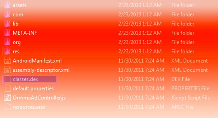 A sample malware android apk file has the folder structure shown below when opened in Windows: