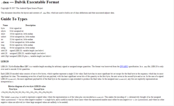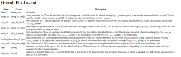 Now that we have read the specifications, we have a good understanding of the overall layout of the dex file, its headers, data types, and the total number of items. We have to deal with a custom data type LEB to extract strings from the data section. We also have to parse the headers to locate each of the referenced items to get to the instructions array.