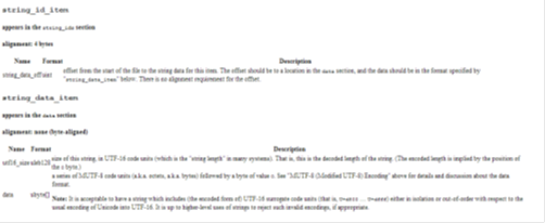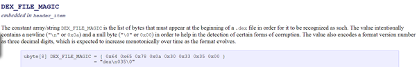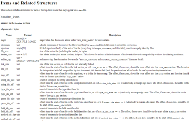 This word comes from hardware specifications or data sheets for chipsets and microprocessors. In terms of file formats like PE and DEX, the documentation is the data sheet. We need the specifications of each format to get a better understanding of how the data is organized before we start coding the parsing class. Let's start with the DEX file specification and see if we can make any sense of it. The Android Open Source Project site gives a good listing. A few excerpts are given below.