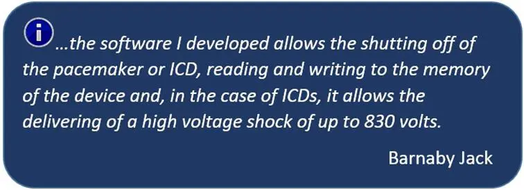 Barnaby Jack also demonstrated that a pacemaker and implantable defibrillator can be exploited to withhold therapy or deliver a deadly 830-volt shock, as the case is with the latter. It can be done via laptop from 30-50 feet away, whose specially-crafted software seizes control over the targeted device through its wireless transmitter.