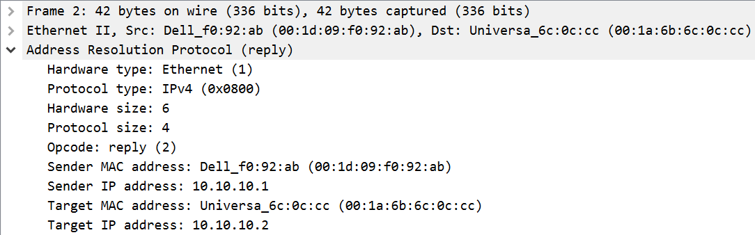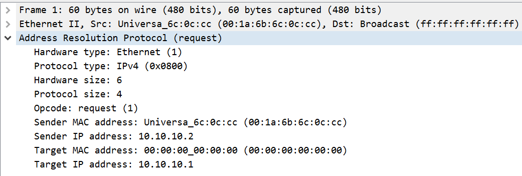 The meat of the ARP packet states the IP and MAC address of the sender (populated in both packets) and the IP and MAC address of the recipient (where the recipient’s MAC is set to all zeros in the request packet).
