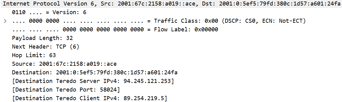 The image above is a screenshot of the 6in4 protocol in Wireshark. As shown, the IPv6 packet is encapsulated within an IPv4 packet. This protocol is used with pre-configured tunnels, where IPv4 is used to route the traffic to the destination IPv6 network’s gateway and IPv6 is then used to route the packet to the intended destination.