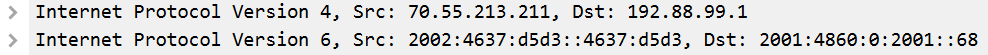 In 6to4, IPv6 addresses are based off of IPv4 addresses. The screenshot above shows headers using 6to4. In binary, the source IPv4 address of 70.55.213.211 is: