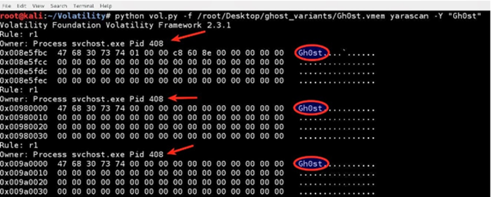 Another way to discover the RAT is to detect its “GhOst RAT process.” It is rather critical in an incident response perspective. The GhOst RAT process hides in network traffic, which resides in memory. Incident responders can discover this process if they have successfully detected network traffic in memory. The following screenshot demonstrates the process — namely svchost.exe with Pid 408 — which incorporates the magic keyword “GhOst.”