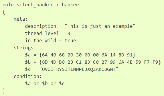 The image above shows a sample YARA rule, pulled from the YARA documentation. As shown, a YARA rule consists of three main sections:
