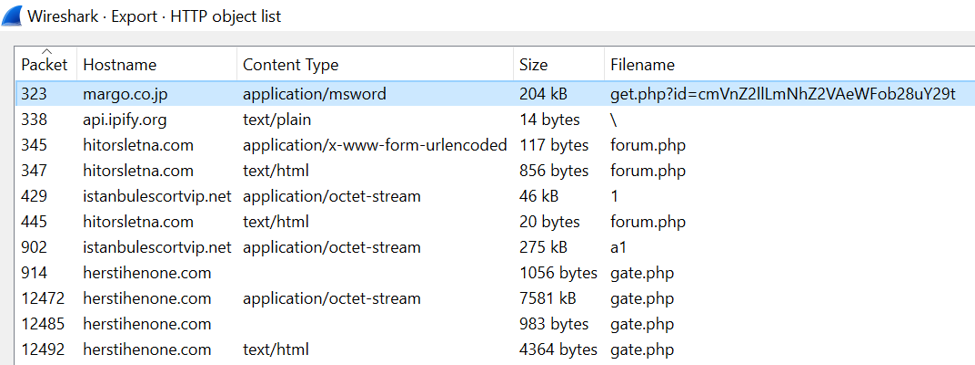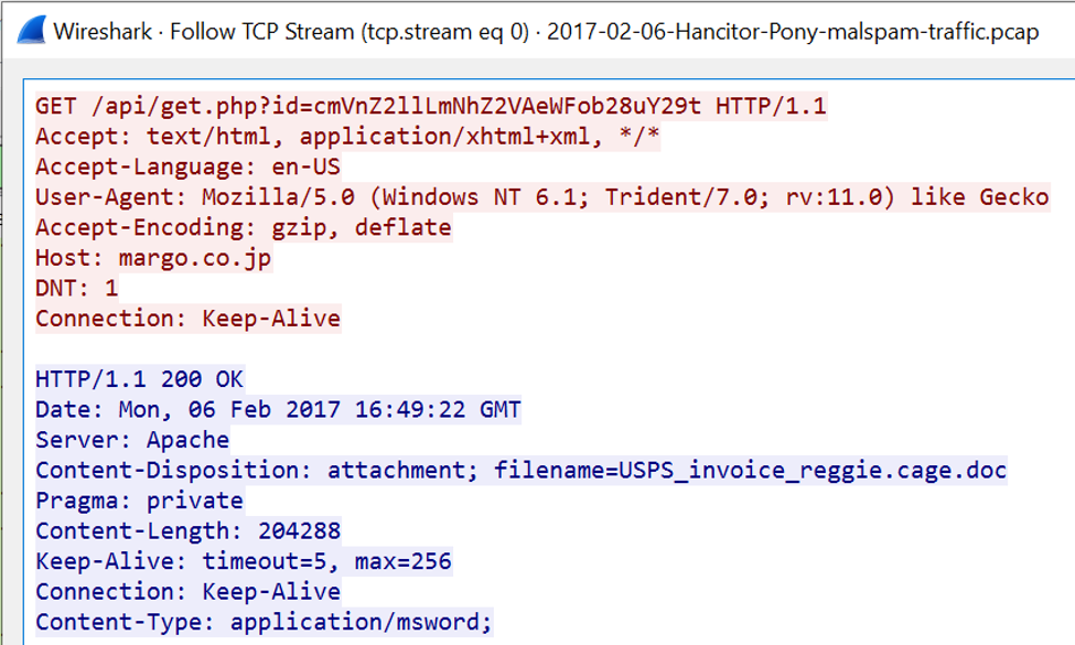 Following TCP streams is useful for quickly determining what is going on in a particular conversation. In this case, an HTTP request to margo.co.jp results in a webpage carrying an MS Word file. This conversation deserves further analysis to determine if this Word document contains macros or is otherwise malicious.
