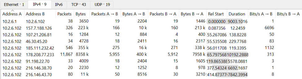 The screenshot above is accessed via Statistics → Conversations. This tab summarizes the conversations between different IPv4 addresses.