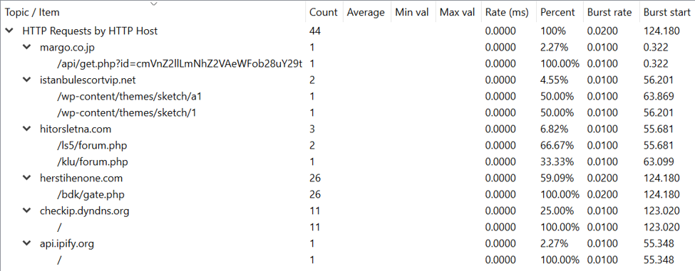 The screenshot above is from Statistics → HTTP → Requests. As shown, it lists the HTTP hosts contacted within a packet capture. This can be useful in checking if an organization’s DNS blacklist is missing any important entries based upon connections to suspicious domains.