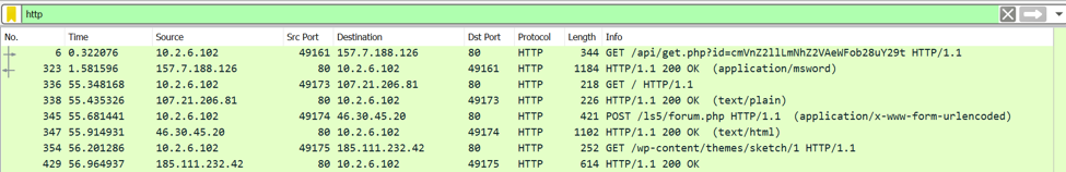 The screenshot above shows traffic filtered for HTTP packets containing host data. However, the default columns in Wireshark don’t include this field, making it necessary to look at packet details to see the value of this field.