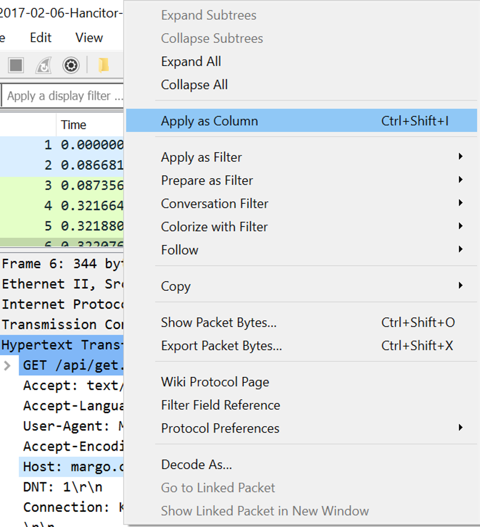 However, Wireshark also makes it easy to add a particular value as a column in Wireshark. The screenshot above shows the process of adding the HTTP Host field to the default view.