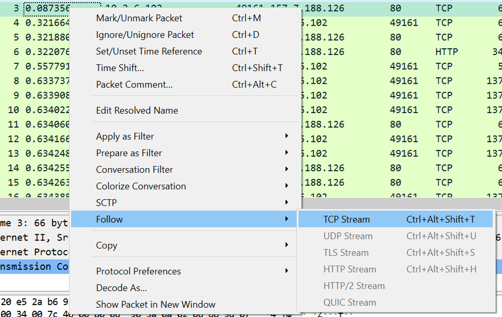 However, Wireshark also enables following a complete conversation. The screenshot above shows the process of setting this up.
