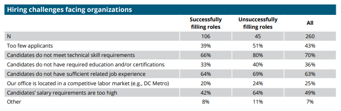 Unsurprisingly, nearly all survey respondents (73%) reported challenges filling open cybersecurity positions, yet major differences emerged when the responses from successful hiring managers were compared to those who struggle.