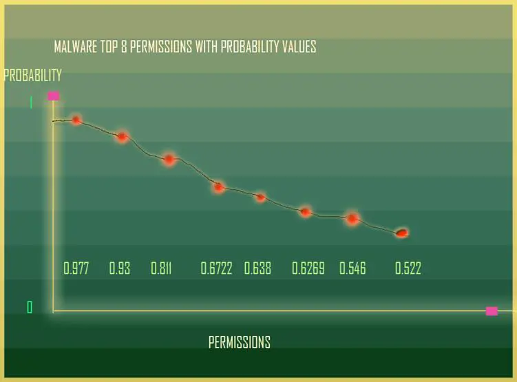 The actual calculations involve just multiplying the set of permissions in each Android file,calculating the Bayes probability for each permission set per malware, and repeating the same for the benign set.