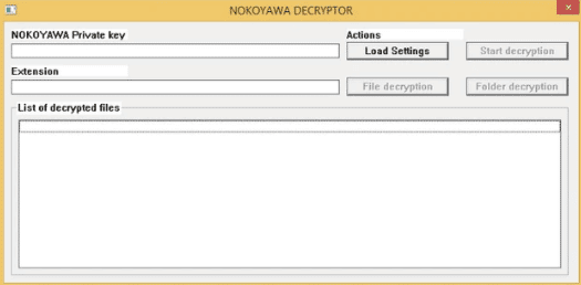 The SHA1 hash of the generated key is appended to the end of each damaged file, along with the public key and the string NOKOYAWA. In addition, the public key in the encrypted file and the private key owned by the Nokoyama operators are necessary to generate the SALSA20 symmetric key for decrypting each damaged file. Below is a picture of the Nokoyawa decryptor.