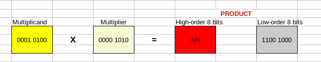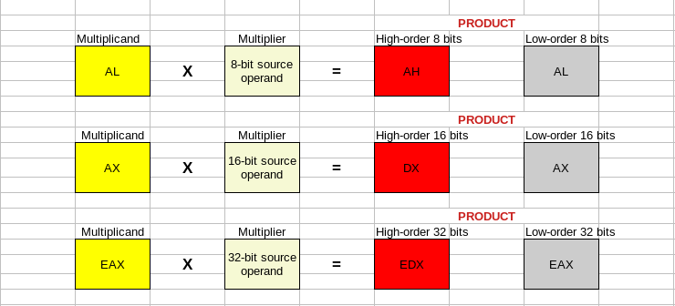 The mul instruction multiplies an 8-bit, 16-bit or 32-bit operand by either AL, AX or EAX. It multiplies by AL if the operand is 8-bit, by AX if the operand is 16-bit and by EAX if the operand is 32-bit. The operand in this instruction is unsigned.