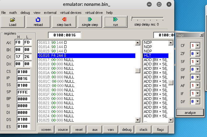 Note the contents of status flags as shown in figure 8. This status of the flags has occurred because the value in register CX is greater than the value in register AX.