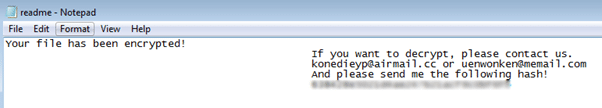 Finally, when the encryption process terminates, the ransomware will create the ransom note named 'readme.txt' on the Windows desktop and inside any folder available on the disk. This ransom note contains two email addresses for the threat actors and a unique hash, which is an MD4 hash of the RSA public key hardcoded inside the binary file.